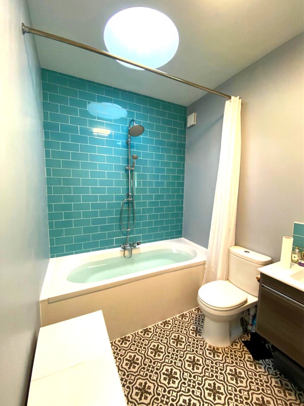 Comfortable double bedroom in beautiful maisonnette with huge light living room with balcony, and well-equipped open plan kitchen. Has double bed with drawers under, a good wardrobe, chest of drawers and a quality blackout roman blind. It's bedroom 4 on the plan, with WC (basin, lit mirror, toilet) adjacent, sharing a beautiful large bathroom on the floor above.