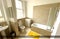 The room is a double bedroom in a spacious flat with high ceilings and lots of natural light. The room comes furnished with a double bed, built-in wardrobes, desk and chair, and mini-sofa chair.