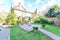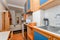 Kitchen features: Oven, Cooker, Fridge, Microwave, Sink, Kettle, Fitted units, pots, plates, cups, glasses, cutlery