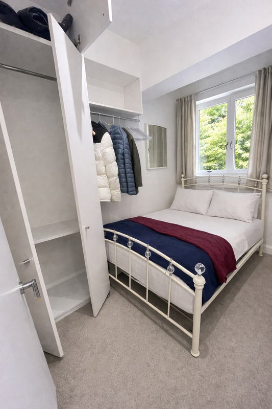The flat is fully furnished and features a shared living room with access to a balcony, a fully equipped kitchen and a private bathroom for the room. The room is furnished with a double bed and storage, ideal for a young professional or postgraduate.