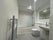 Bathroom, with bath & shower, washing machine and laundry cupboard separate from kitchen.