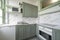 Kitchen compact yet thoughtfully designed, newly fitted units to match the original living room fittings, reconstituted resin marble worktop and splashback, and black-and-white mosaic flooring. Appliances include a fridge/freezer, oven, hob, microwave, sink, and mixer tap.