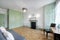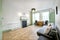 Living / Sleeping Area with new herringbone oak flooring throughout, two sash windows, and a feature fireplace. The wall-fitted wardrobes are the original 1930's art deco fittings which have been carefully restored to provide excellent storage, and a fully recessed Murphy pull-down double bed has been fitted to offer flexible living space.