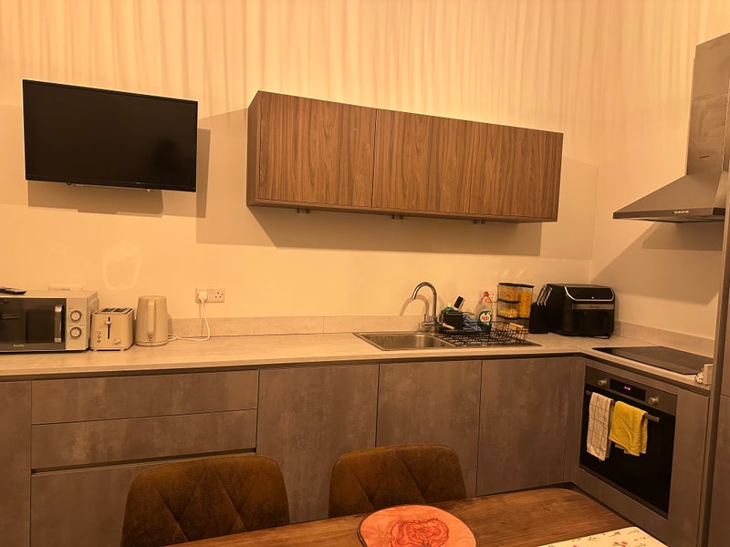 The flat features three generously sized bedrooms, a bright and sociable kitchen complete with dining table—ideal for shared meals or entertaining—and modern conveniences including a dishwasher and washing machine. A separate utility area provides additional household storage space. Aswell as two seperate toilets.