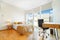 An open plan kitchen is adjacent to the lounge featuring a range of integrated appliances including a washer-dryer, fridge freezer and dish washer in addition to new: microwave, kettle, toaster, pots pans cutlery and glassware plus utensils.