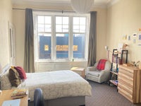 The room is spacious and gets a lot of natural light. Includes double bed, desk and chair, bookshelf, chest of drawers, wardrobe and large storage closet.