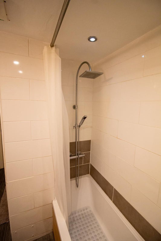 The bathroom has a shower as well as well as a bathtub with plenty of storage space.