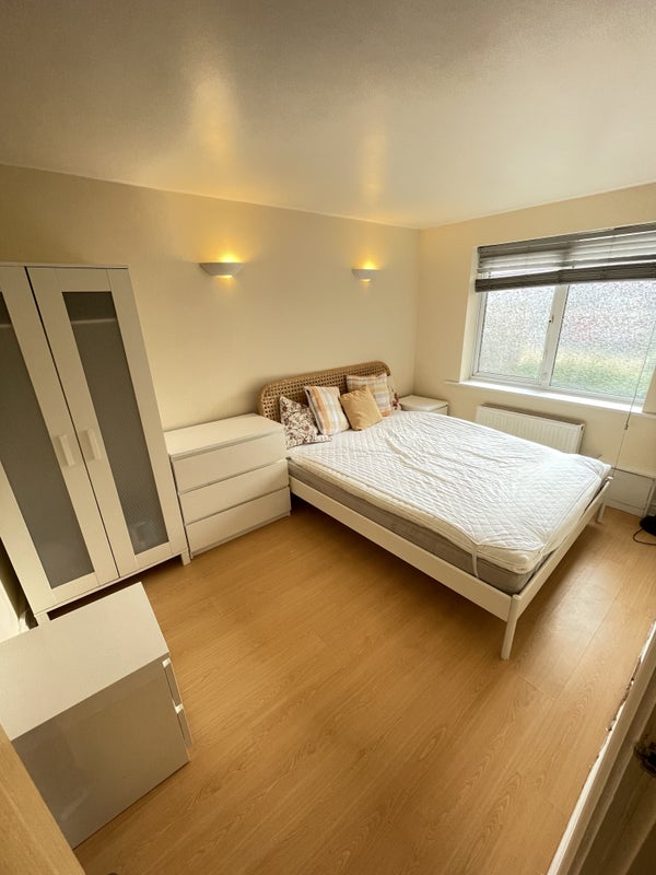 The bedroom has a wardrobe, chest of drawers, king size bed, large window, standing lamp and 2x bedside drawers.