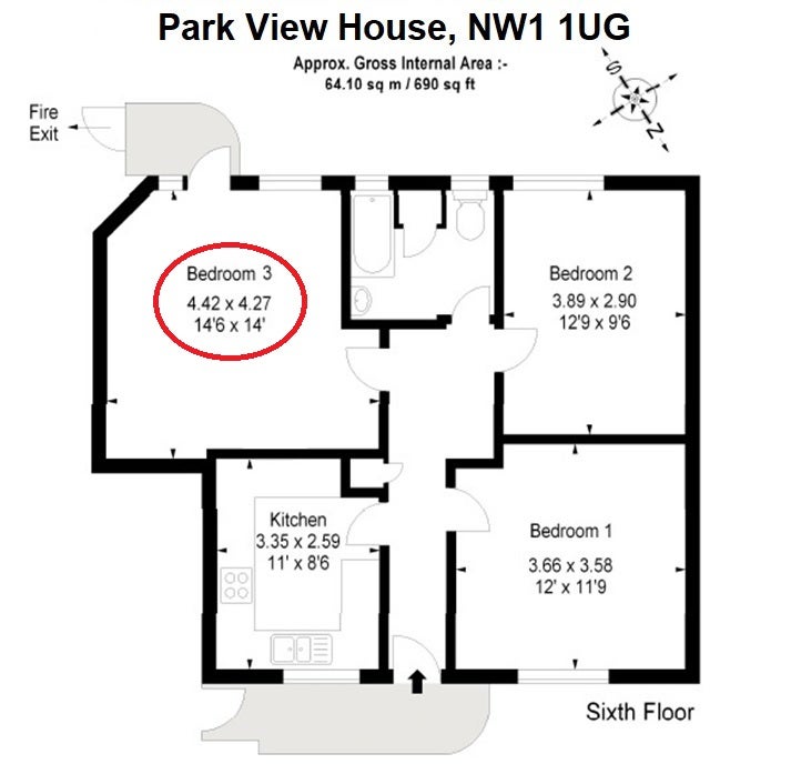 The bedroom is fully furnished with dimensions of approximately 4.4x4.3m and is located in Park View House, an art-deco building behind St. Pancras station. The room is a part of a 3 bed flat, to be shared with two fantastic flatmates (responsible and friendly male students).