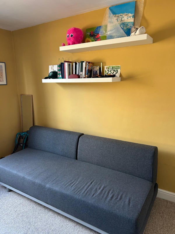 The room available is furnished with a queen‑sized sofa bed, which works well for everyday use, though adding a mattress on top would make it more comfortable. The room also includes a desk, wardrobe, lamp, and a couple of bookshelves.