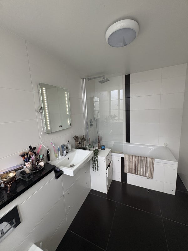 The kitchen/livingroom space includes TV, washing machine, dishwasher, airfryer, microwave and Roomba (automatic hoover).