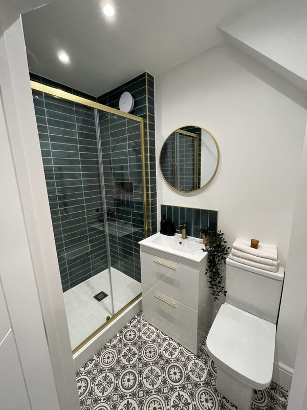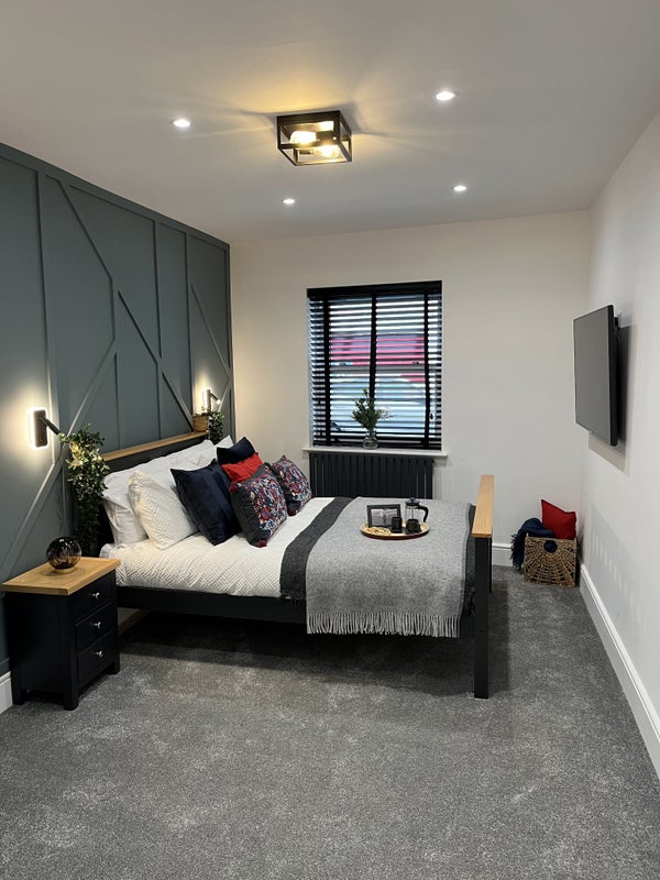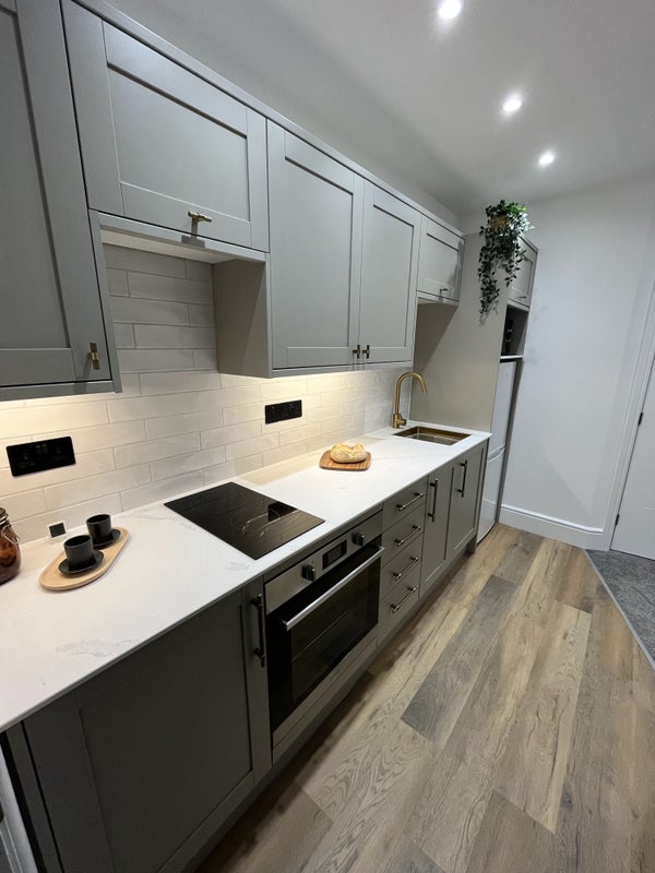 Included in the Bedroom space is a 50 inch Smart TV, Double bed with brand new high quality mattress, bedside tables wardrobe and storage. Behind the bed is a feature panelled wall that is the perfect backdrop to your bedroom area. You have a modern en-suite with walk in shower and your very own private fully fitted kitchen separate from the main communal kitchen. Your kitchen includes storage cupboards, an oven, microwave, fridge freezer, sink and plenty of worktop space for food preparation.