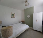 Bedroom overlooks the garden, with new wardrobe, inbuilt desk, side tables and lamps, new double bed + mattress.