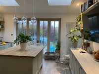 Guests benefit from a private entrance. Parking space. Garden front and back. The house is fully equipped for a cosy and happy home. Neutral colours throughout with a new oak wooden floor in the kitchen to add to your comfort. There is a spacious living room, dining room and a wonderfully bright kitchen in olive green. Fully equipped. You won't be disappointed.