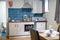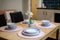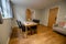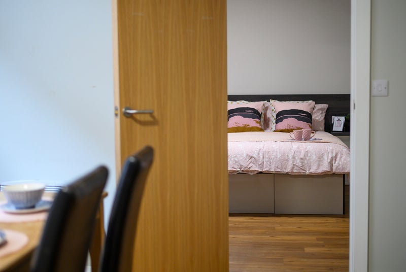 Each room contains a double bed with bedside table, study area with chair, kitchen with combi-oven, hob and fridge with freezer compartment, and en-suite shower room.