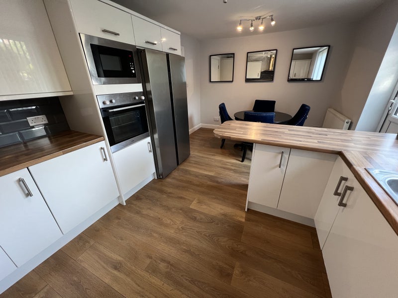 Modern kitchen with integrated appliances, The light and airy living space includes a sofa and internet TV. Each of the 4 good-sized bedrooms contain a double bed, desk, noticeboard, wardrobe, and chest of draws, as well as a fully tiled modern en-suite shower room in all rooms. The property is completed with a large garden area to enjoy some lovely summer sun.