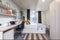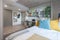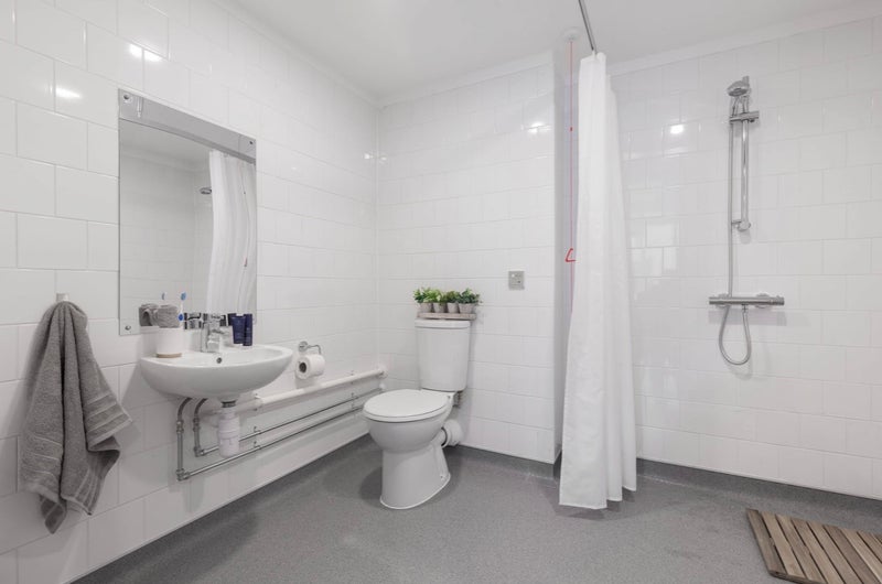 Wet-room (very generous size) bathroom, self catering, fridge/freezer, double bed and extra floor space, good storage.