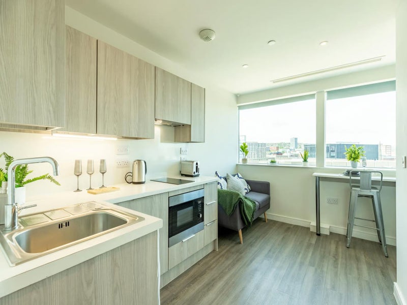Features include lots of under bed storage, a big closet, private bathroom, self-contained kitchen and study area.