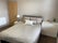 This bedroom is furnished with double bed and a quality mattress. A double wardrobe with hanging rail and a chest of drawers. There is an individually controlled radiator in the room. There are blinds and curtains at the windows and a wooden floor.