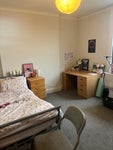 Room comes with bedside table, 2 Chester drawers, large desk, large wardrobe, double bed.