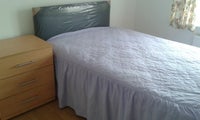 Bed including mattress, bedside table, wardrobe.