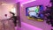 Main lounge features luxurious floor tiles and media wall. Seperate dining table with 4 bar stools.