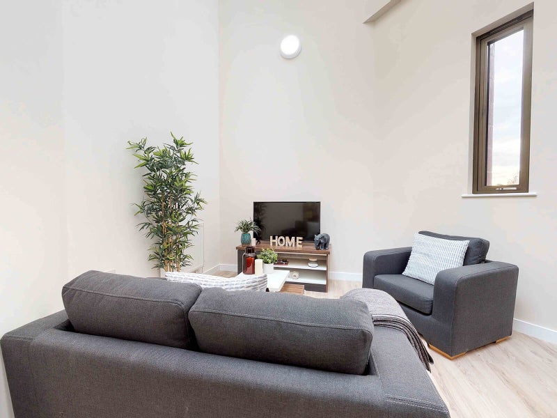 Modern 2-bedroom apartment (Furnished) perfect for individuals, friends, or couples. Enjoy an open-plan living/kitchen area, two double bedrooms, each with a private en-suite featuring rainfall showers and heated towel rails with sleek fixtures. The kitchen comes fully equipped with high-spec appliances like Microwave, Oven Grill, integrated Fridge & Freezer, washing machine and dryer and the living space includes comfy sofas and a smart TV for easy relaxation. The room also comes with a wardrobe, study desk, office chair and side tables.