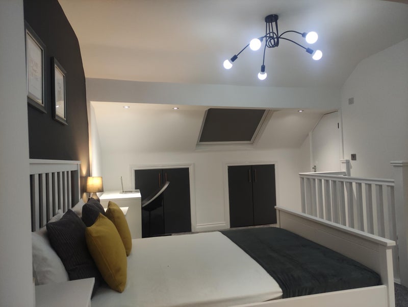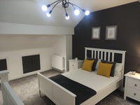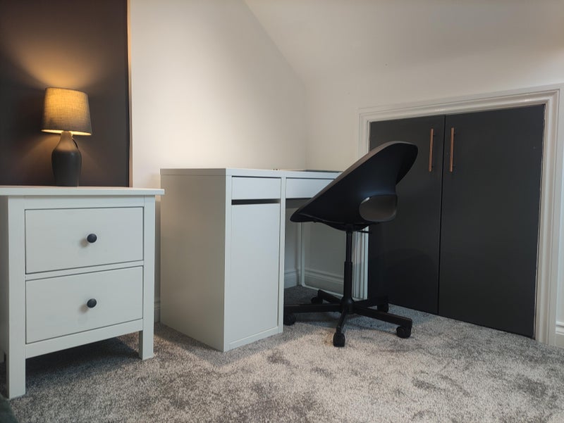 We have 1 room available. The room comes complete with high end solid oak furniture, consisting of a bed, bedside table, chest of drawers, double wardrobe, desk and chair.