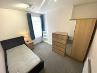Recently decorated modern, spacious single room in an HMO. Furnished with 1 single wardrobe, chest of drawers, single storage bed, table and chair. 1 Bedside table and lamp. Situated on the first floor at the rear of the house with plenty of natural light from a large window