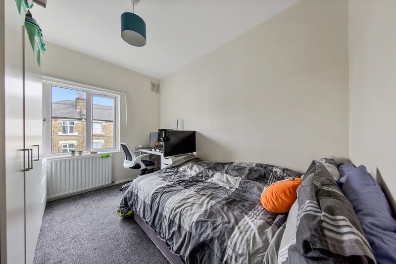 The room is fully furnished (bed + storage) in a clean,