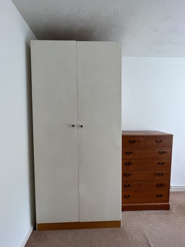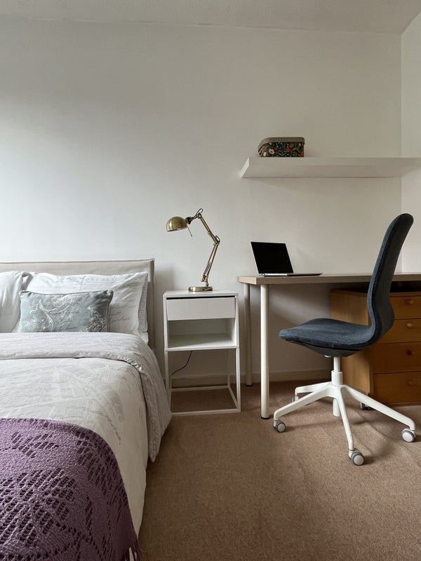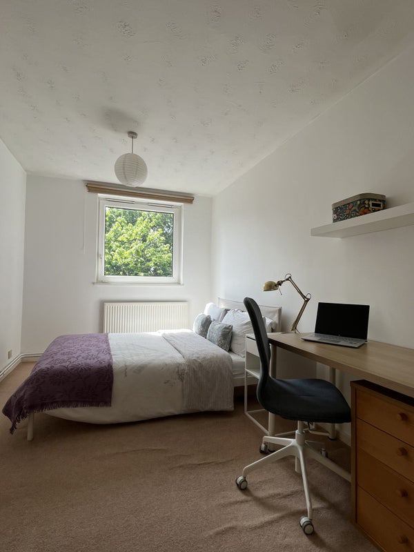 The available bedroom comes with a double bed, chest of drawers, desk, wardrobe and a big mirror. And it's south-facing too.