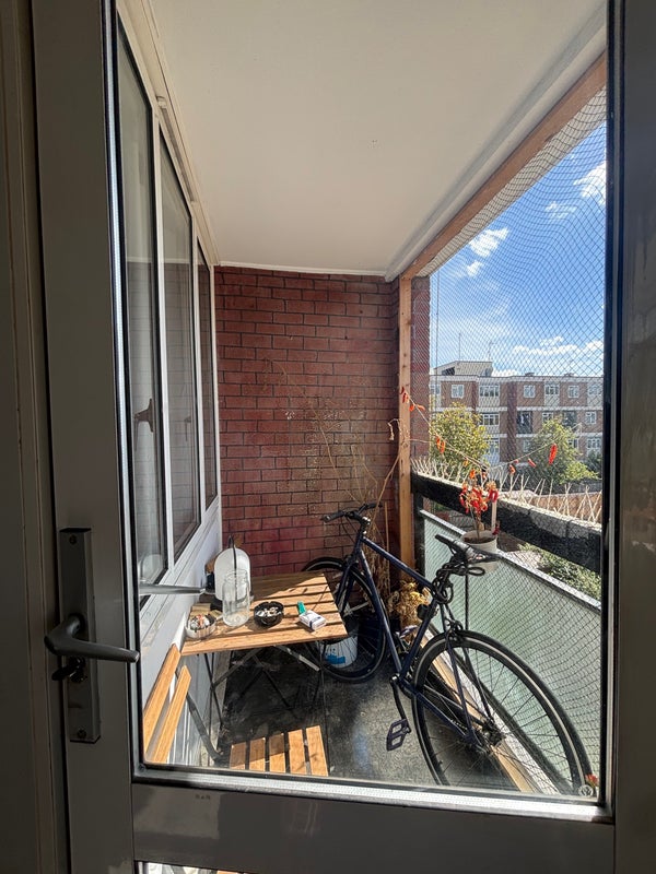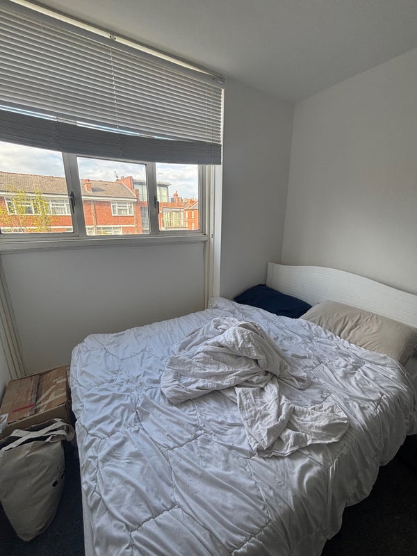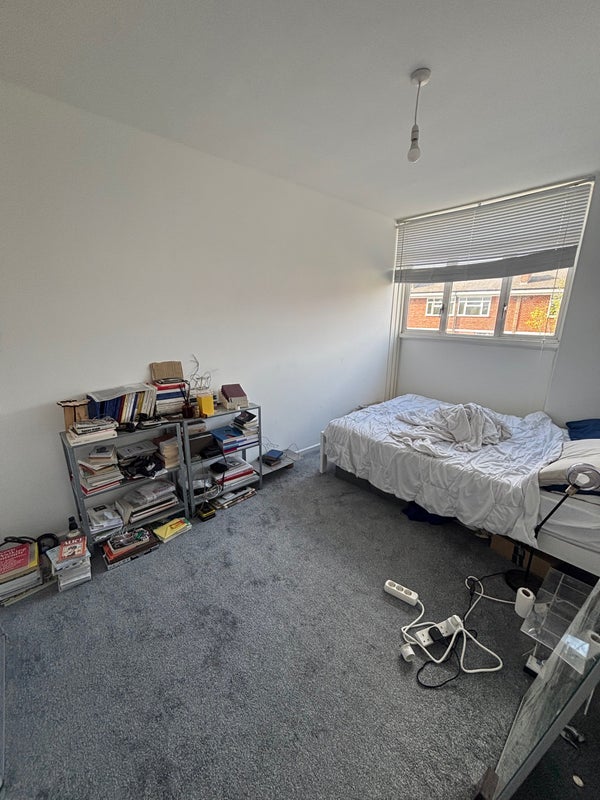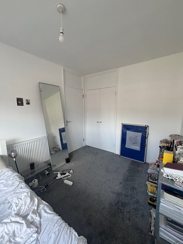 The room is a spacious double room with a built in wardrobe and a double bed and lots of light. The previous flatmate had some shelving but they’re taking that with them.
