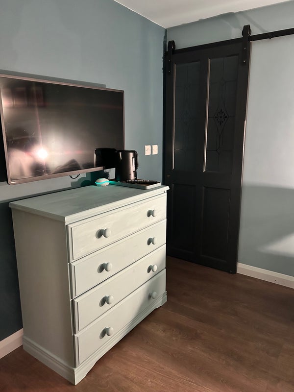 Room equipped with small double bed, TV, chair, chest of drawers and corner cabinet. There is also a toaster and kettle in the room and a small fridge for the essential pint of milk!