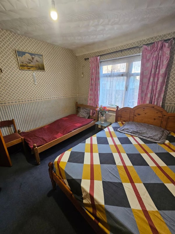 A bright double bedroom available in a clean 3-bedroom shared house with one bathroom, shared kitchen, living area, and garden.