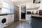 Spacious, fully equipped kitchen with modern appliances: large oven, 5-burner gas hob, washer-dryer, two tall fridge-freezers, and all essential kitchenware (cutlery, pots, toaster, kettle, etc.)
