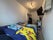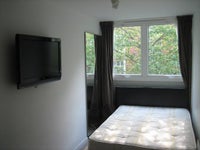 This is a bright double bedroom overlooking a quiet, charming street with trees. The double bed has a superb high quality orthopaedic mattress. There is a built in wall wardrobe with hanging rail and shelves, large wall mounted TV and desk. The mirror you see in one of the photos is actually two doors behind which has s a deep double wardrobe for your clothes.