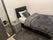 Fully furnished room with small double bed, chest of draws, and modern wardrobe.