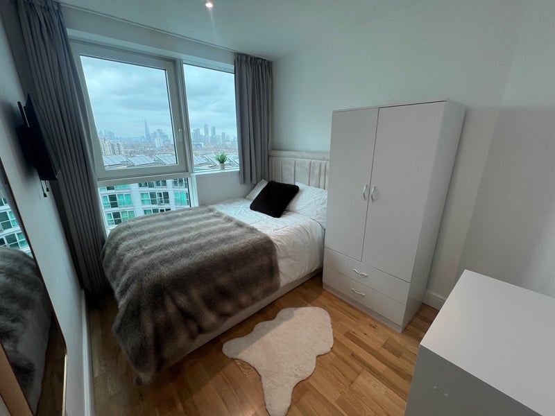 The flat is bright, modern, and calm, with floor-to-ceiling windows offering unreal panoramic views of the London skyline. There’s plenty of natural light, stylish furniture, and a clean, tidy living environment.