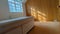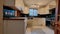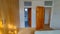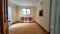 Wooden flooring, service hatch through kitchen, electrical power connection points, kitchen access door.