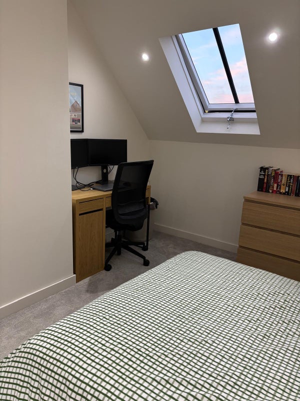 We have a spacious large double room (2nd shown in video) with a private ensuite available in our well-kept 3-bedroom flat. The room is generously sized, with plenty of space for both relaxing and working from home, along with having your own bathroom.