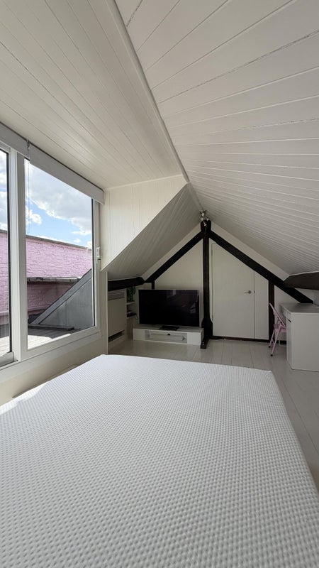 The flat is a proper industrial loft with character - massive windows, high ceilings, and always flooded with natural light.