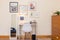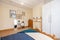 The room is furnished with a double bed, wardrobe, chest of drawers, bedside table, desk and chair