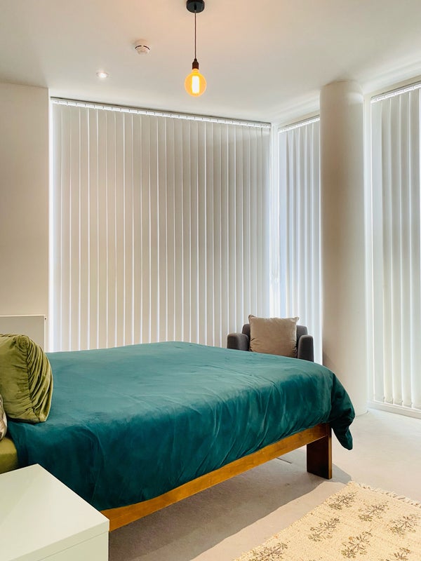A peaceful double bedroom with a king-sized bed and under-bed storage, floor-to-ceiling windows, and lots of natural light. A small desk/workspace and comfortable armchair make it easy to work or unwind.