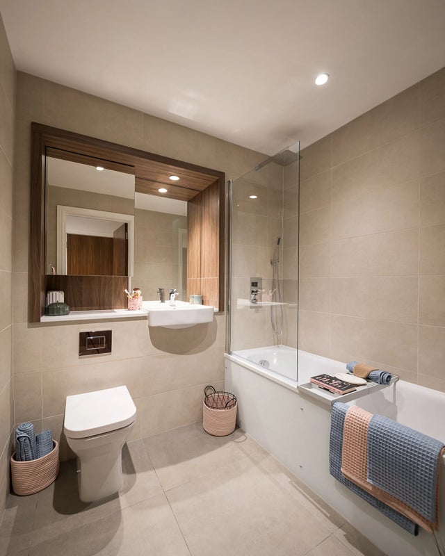 Tones of rich walnut are complemented with brushed metal throughout, creating a sense of contemporary urbanity. Walnut veneered doors and Amtico flooring are lifted by matte white walls and ceilings, as well as brushed metal switches and door handles. The kitchens are sleek, with concealed handles, soft-close doors and two tone designer units. A Recon stone worktop and splashback houses the stainless steel sink, including monobloc mixer tap. The fully integrated Smeg appliances include oven, ceramic hob, fridge/freezer, washer/dryer and dishwasher, making it easy for first time buyers to move straight in. Bathrooms are finished with porcelain tiles, mirrored cabinets and a white bathroom suite, complemented by chrome fittings, including a heated towel rail. With oatmeal carpet and fully fitted wardrobe in the Primary Bedroom, the bedrooms are designed to be clutter free spaces of calm. Heating is thermostatically controlled and double glazing throughout maximises heat efficiency. Data and TV sockets are intelligently distributed throughout each home, with TV sockets set to Sky+ if a subscription is desired. This apartment has its own audio/ visual entry phone system for secure access to ensure the safety of residents. There are lifts to all apartments levels and separate cycle and refuse stores.