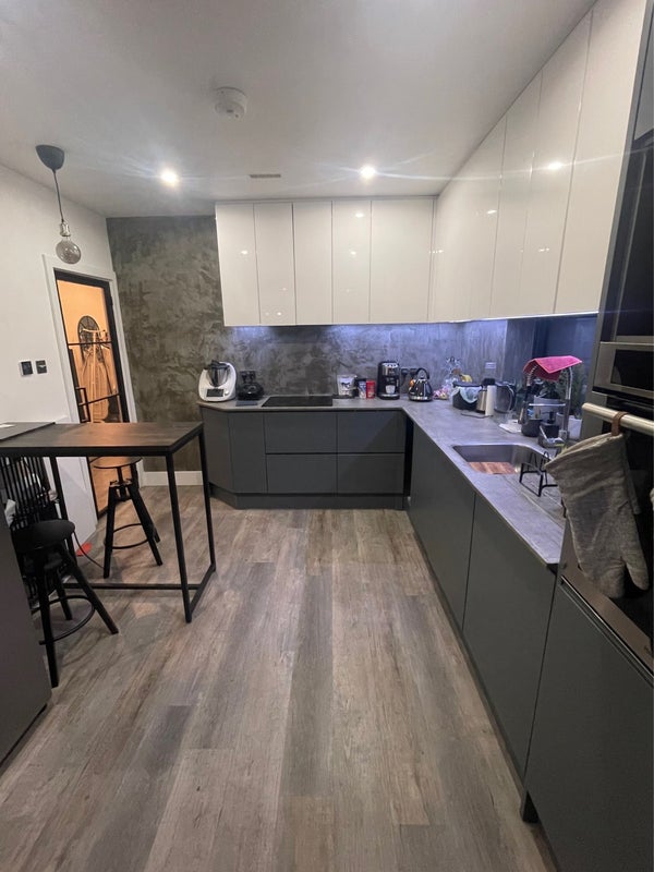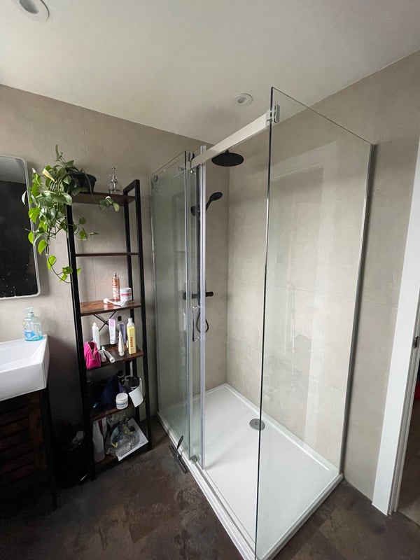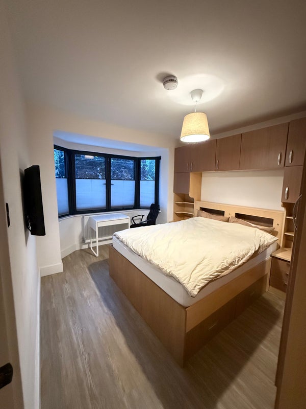 Large 160cm bed with plenty of storage, a TV and a desk with a chair. Bathroom shared with two other people. House is currently being extended at the back therefore there is no access to the garden.