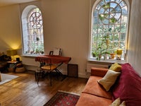 Well-lit single room with raised platform bed, gorgeous original window and high ceiling in a beautiful Victorian conversion, sharing with two females.