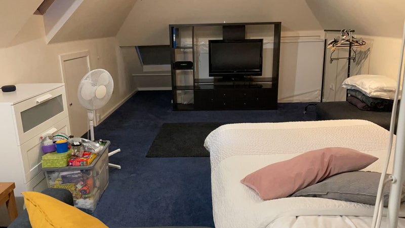 We have a large beautifully converted loft room with ensuite bathroom available. The room is furnished with a single bed, desk, chest of drawers, hanging rail, side tables, large storage unit and TV.