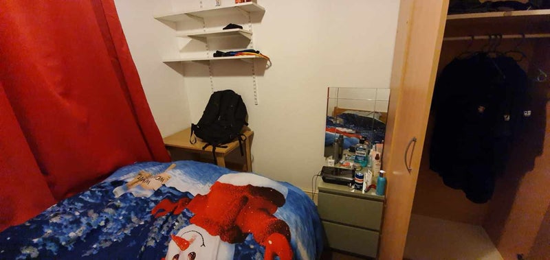 Decent sized single room at circa 6.9msq and contains pretty much everything you would expect including a small double bed, chest of drawers/wardrobe and a small desk/chair. There are also some shelves - perfect to store all your books/niknaks, and a TV point. The room is located on the first floor at the front of the property and contains plenty of natural light. It would would suit either a working professional or Masters/PhD student/recent Graduate or someone who travels light and is available from circa 22nd April.