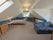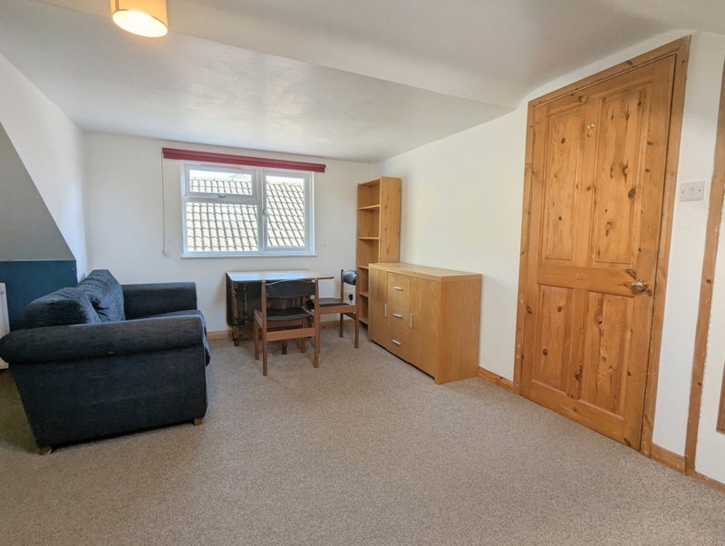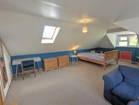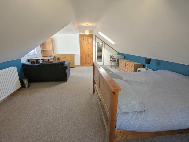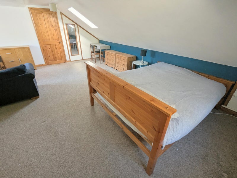 Spacious fully furnished bedroom and living room with king sized bed, sofa, chest of drawers, built-in wardrobe, desk and chairs in a converted attic.