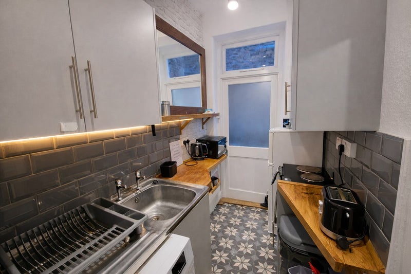 Shared kitchen with x2 Kitchen units, fridge freezer and hand